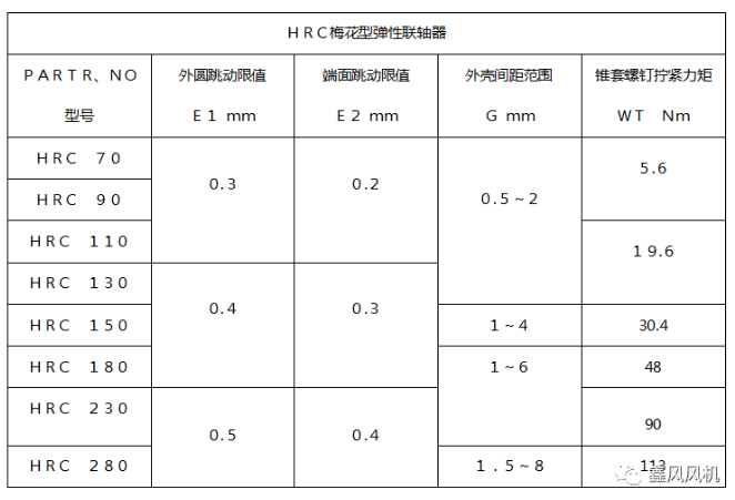 3、連接的兩軸應(yīng)盡可能同心:須接照?qǐng)D標(biāo)檢測(cè)聯(lián)軸器的殼罩外圓和端面的跳動(dòng)E1 、E2,跳運(yùn)值應(yīng)符合表中規(guī)定值以內(nèi)。